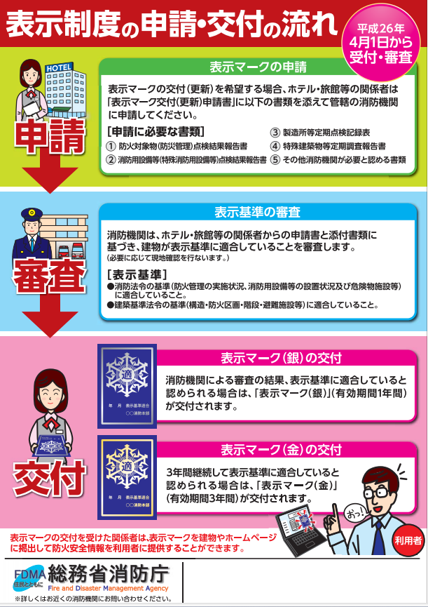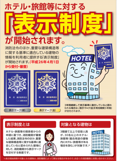 表示制度とは、3階建て以上で収容人員が30名以上のホテル・旅館等が対象で、そのホテル・旅館等の関係者からの申請に基づき消防機関が審査した結果、消防法令のほか、重要な建築構造等に関する基準に適合していると認められた建物に対して、消防機関から表示マーを交付する制度です。